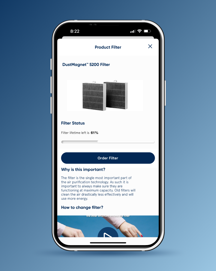 Blueair’s proprietary RealTrack algorithm accurately calculates the remaining filter lifetime based on fan speed, usage time and pollution levels.