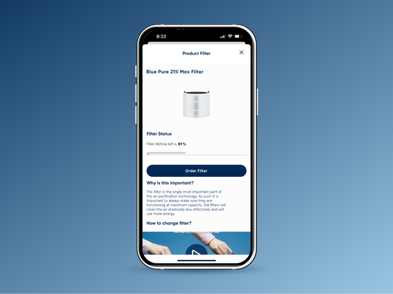 Ci-dessus: un aperçu de l'application BlueAir avec la technologie RealTrack qui surveille le statut de filtre et vous rappelle quand il est temps de changer.