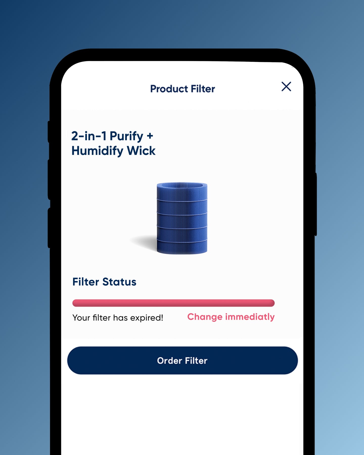 Un voyant de changement de filtre qui vous alertera au moment de remplacer le filtre. Vous pouvez également vérifier l'état via l'application bluaire.